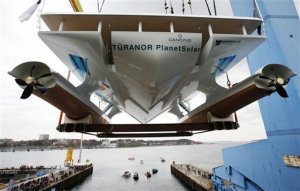 The catamaran-style yacht sporting some 5,400 square feet (500 square meters) of solar panels was put into the water Wednesday in the northern German city of Kiel.”
