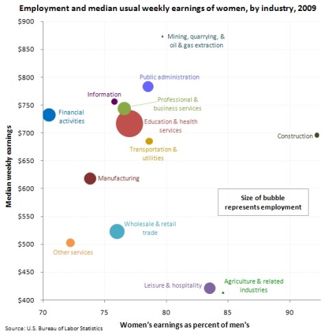 Sociological Images also comes through with some data about women and the workforce and the precentage of money they make in relation to a man doing the same job.