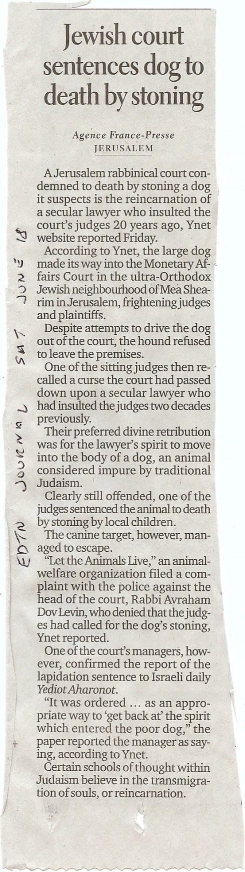 Two decades ago, in a Jewish court in Jerusalem, a secular lawyer was sentenced for insulting the court. I’m not sure, but I think the penalty for contempt of court around these parts is a fine, maybe a short jail term. I welcome any clarification on this point, as law is no speciality of mine. Whatever it is, it’s nothing like what the courts hand out in the “holy land”. The offending lawyer was cursed by the courts, that his soul would be reincarnated into the body of an impure dog.