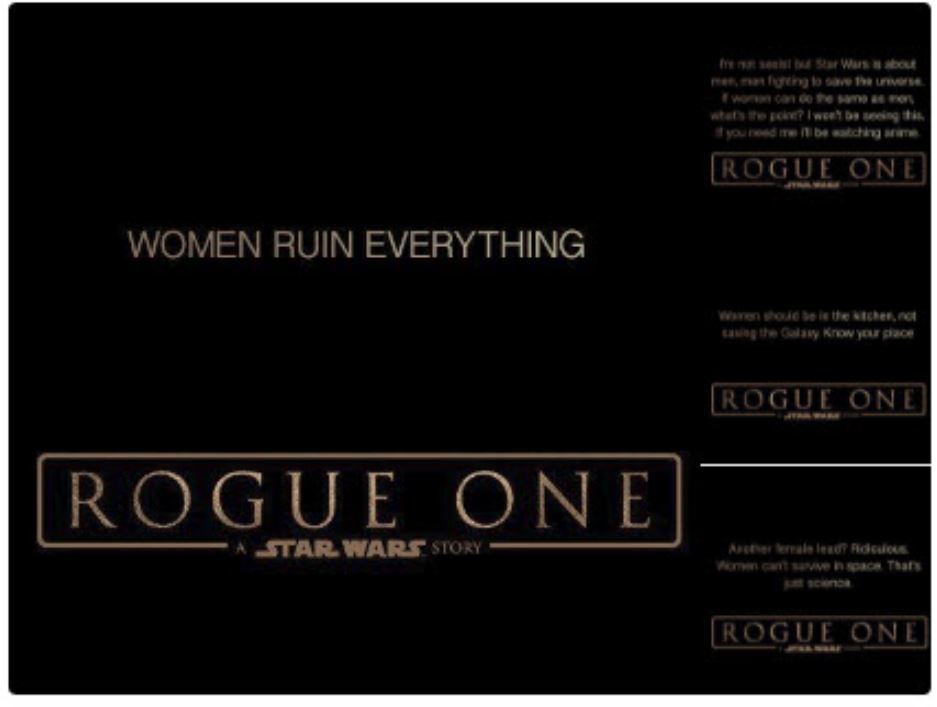 One Star Wars movie with a female lead? Unacceptable – but two? The male tears are flowing strong and fast on the comment section of the Rogue One trailer. Of course, someone had to make it official, so here a few updated movie posters featuring the sentiments of dudes who feel keenly unrepresented in Star Wars media.