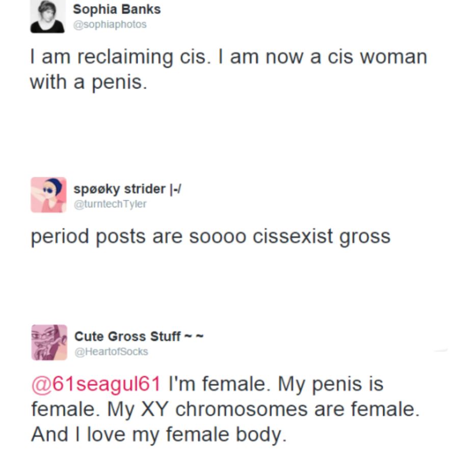 Anyhow, these tweets by transactivists are the embodiment of male entitlement mixed with the inherent narcissism of identity politics (IP being the polar opposite of effective Feminism). Enjoy. (?)