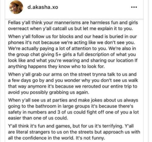 Women are the ones saying to each other ‘let me know you get home safe’ or ‘text me when you get in’ – MEN are not doing that with each other because they don’t have to think about personal safety.
