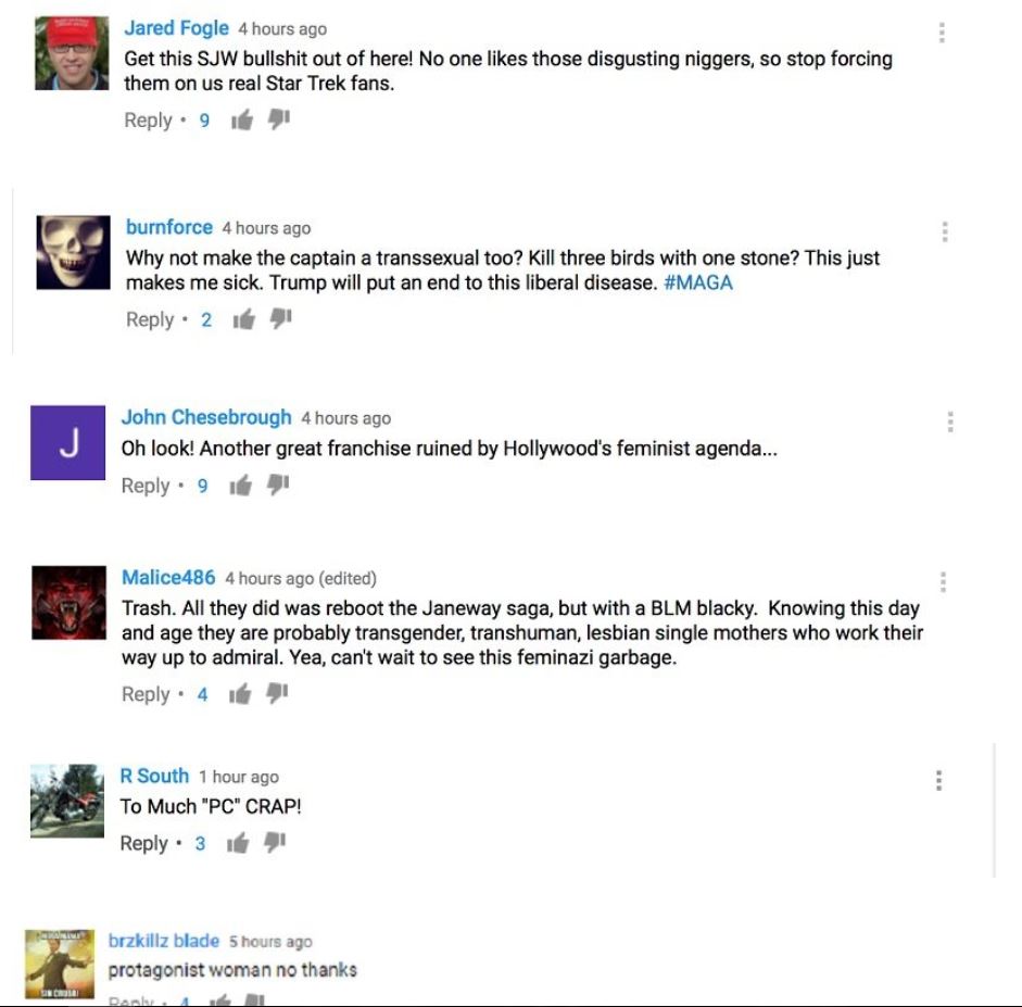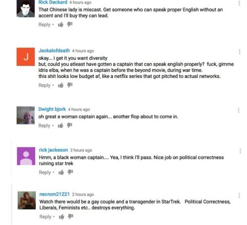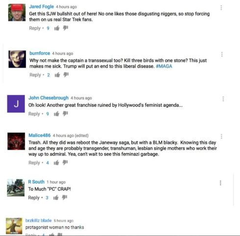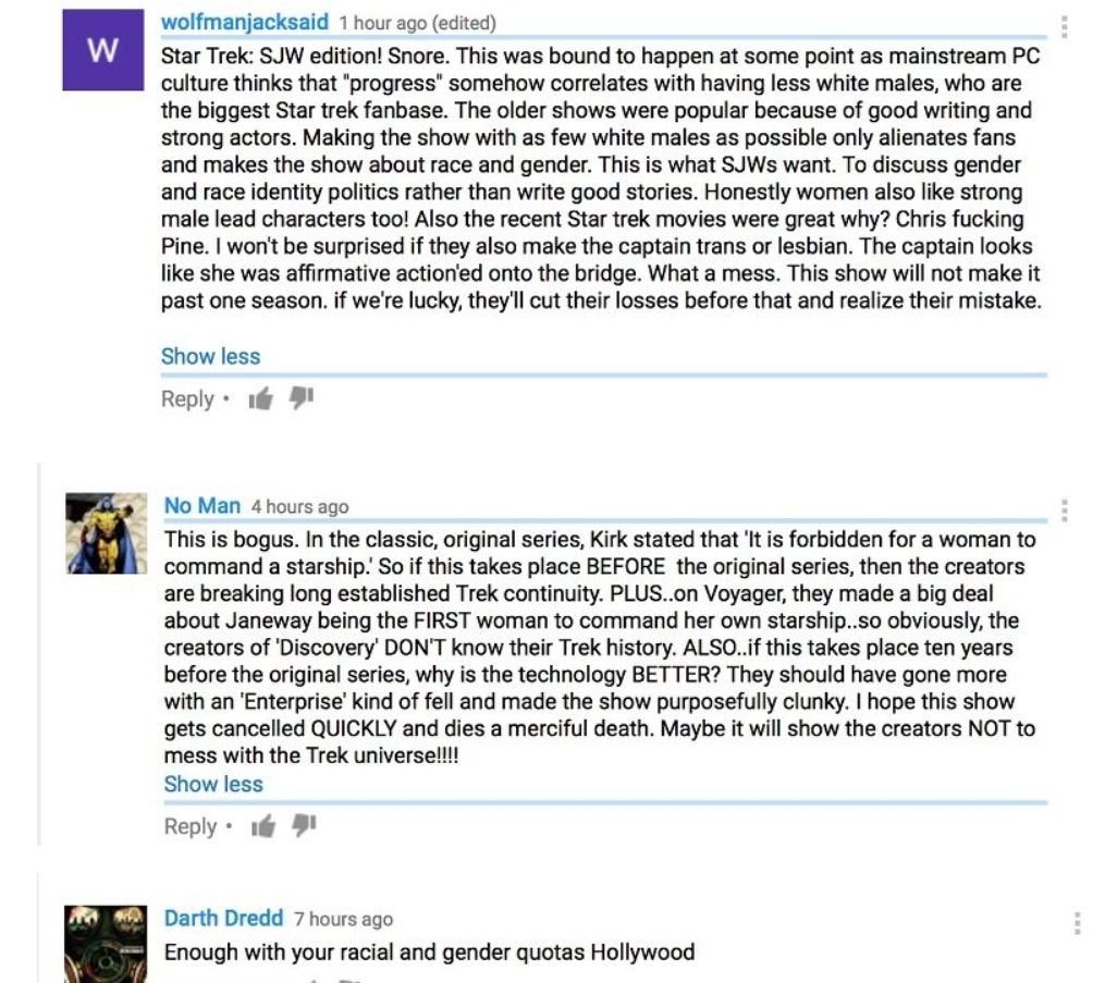 But unfortunately, back here on earth the most oppressed class in Western society – white males – is trumpeting their dismay… nay! anguish! over the lack of white dudery on the upcoming CBS Star Trek Discovery series.