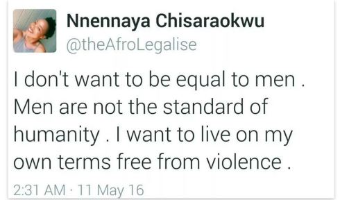 This is what radical feminists mean when we say that feminism isn’t about equality, but is about the liberation of female people from male people. We don’t want to be as violent as men are.