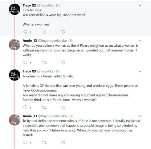 Pretty much every conversation I’ve had with people who, when it comes to basic biological facts, decide it necessary to jump through tortured hoops to evade this simple question. Is there a more clear example of men trying to impose their version of reality on the world? We cannot change sex (facts, don’t care about your feelings even hurt male ones). Yet we have a whole swath of the population that are willing to throw down to avoid the facts of the matter. I’m heartened that I’m starting to see women taking the piss out those who support male delusions of gender.