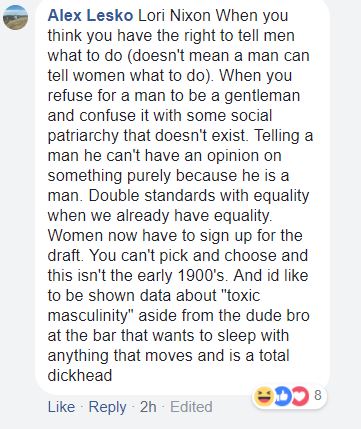 We shan’t plumb the depths of Alex’s heavy mantle of skull deadening ignorance (at least not today) . The take-away here is don’t be like Alex, because full frontal ignorance isn’t a look good on anyone. As illustrated countless times here on DWR, the female experience in society is radically different than the male experience, so any notions of “equality” espoused by men need to be quietly tucked away, and saved for the day when they actually concur with reality.