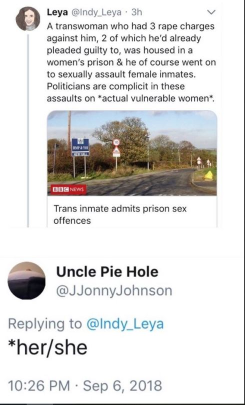 One cannot identify into nor identify out of the class you’re in. I’m curious as to how many more sexual assaults, in this case, and rapes of females in others it will take before we as a society can acknowledge that importance of grounding the distinctions of biological sex in empirical reality (human beings are generally sexually dimorphic). Because, clearly, prioritizing the gender feelings of men over the safety and security of women is not acceptable.