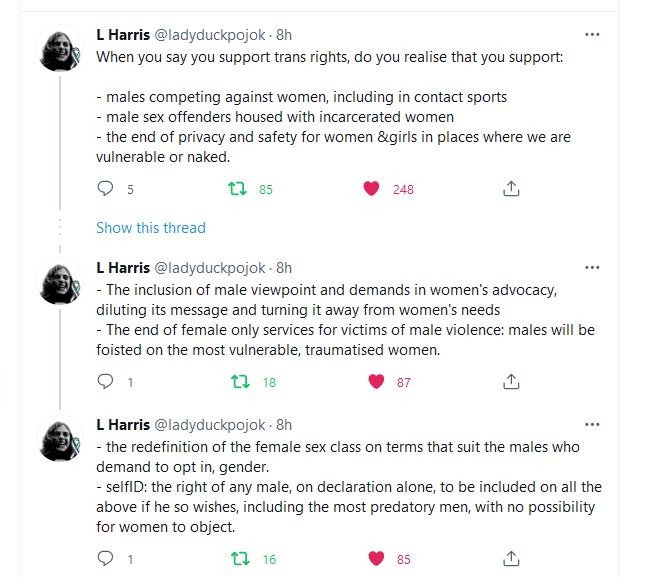 So, the challenge when you hear the term ‘trans-rghts’ is this – which rights currently do they not possess, and which rights are they actually campaigning for. If the results look like what Ms.Harris is describing, you should seriously consider withholding your support for what is most decidedly an infringement of female rights and boundaries.
