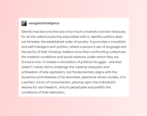 I mean, the short answer is that identity politics are useless. But the long detailed answer is good too.