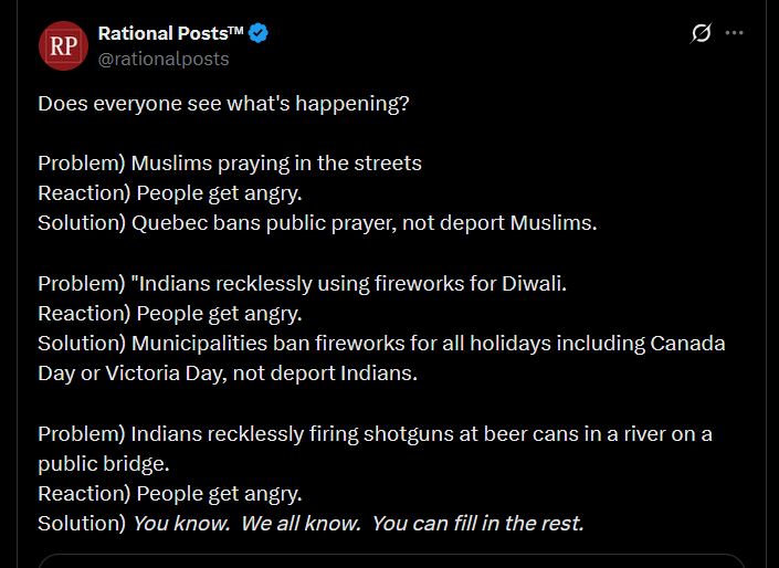 The solution to thwart this insidious strategy of systematically stripping Canadians of their rights lies in enforcing the law with unyielding equality, blind to race or religion, a principle that stands as the bedrock of a just society. The Rational Posts narrative reveals a troubling trend: public outrage over Muslims praying in streets or Indians celebrating Diwali with fireworks, and now shotguns on a bridge, triggers blanket bans, from Quebec’s prohibition on public prayer to municipal fireworks restrictions, effectively punishing entire communities rather than addressing specific transgressions. This corrosive approach, echoing the divisive echoes of Jim Crow or apartheid, corrodes multicultural unity and foments resentment, as social cohesion studies irrefutably demonstrate. Instead, precise legislation targeting reckless acts, such as discharging firearms irresponsibly, must replace these broad edicts, ensuring accountability without stifling cultural expression. Fair laws unite: bans divide. Let us, with urgent resolve, choose the former and reclaim a Canada where justice, not prejudice, prevails.