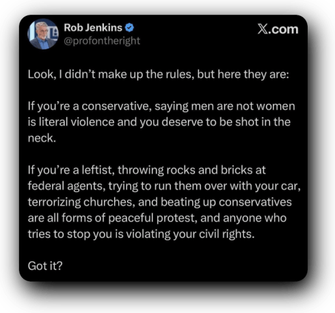 The X post is doing something familiar: it takes two ugly sentences, assigns one to “conservatives” and one to “leftists,” and then says, See? The rules are different. It’s a compressed morality play about “two-tier” reality—speech treated as violence on one side, actual violence laundered as “peaceful protest” on the other. The point isn’t subtle. The point is that subtlety is for suckers.