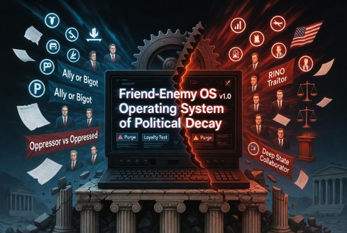 That is why factions organized around “no enemies to the left” or “no enemies to the right” almost always radicalize inward. The outer edge of the movement becomes untouchable because criticizing it risks helping the enemy. So the only safe targets are moderates, doubters, and fellow travelers who fail the loyalty test. The left protects its most extreme activists and attacks liberals who cannot keep up. The right protects its own hardliners and attacks conservatives who still think prudence, constitutional restraint, or factual discipline matter. In both cases, the center is hollowed out first. The ratchet always turns one way: toward greater fanaticism, greater purification, greater moral ugliness. Truth is subordinated to solidarity. Principle is subordinated to faction. Politics ceases to be the art of living together under conditions of disagreement and becomes a permanent sorting mechanism for friends, enemies, and suspects.