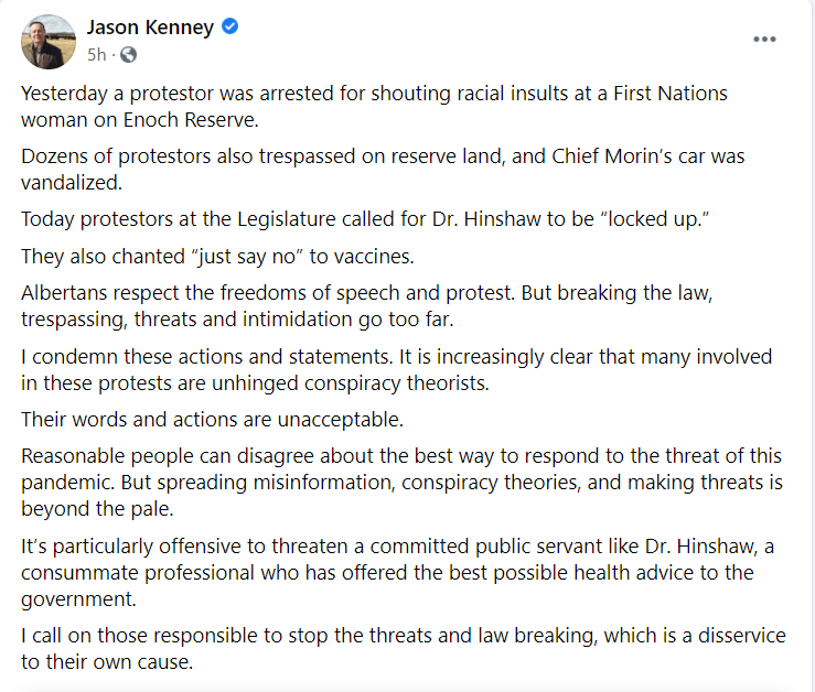 This is of course to people protesting the fencing off of a church (from what I understand). These people decided to trespass on Enoch Cree Nation land, threaten and assault their members, and vandalize their property. And it’s here where I get a certain sense of schadenfreude. Jason Kenney has been stoking the far right and using them to his own political means here in Alberta since he joined provincial politics. These people are his base, the people who will show up en-masse to rallies and canvas for him. They’re the ones that just won’t shut up about politics in the work space. They are the ones who have Nutley and TruDOPE bumper stickers on their vehicles, as well as some more unsavory stickers. So I wonder how his base is going to react to what is essentially a post asking people to calm down and come back to reality. Well lets find out.