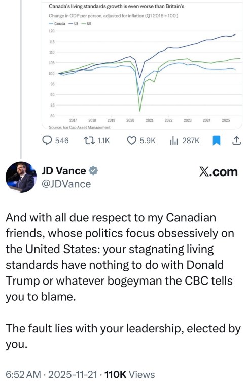 Canada finds itself at a crossroads. In recent years, per capita GDP growth has stalled, productivity remains sluggish, and housing, healthcare, and infrastructure face mounting pressure. These trends have prompted urgent debate about the causes of stagnation, ranging from global economic shifts and demographic aging to domestic policy decisions. Among commentators, JD Vance recently sparked attention with pointed critiques of Canada’s immigration policies and multicultural model, framing them as principal contributors to declining living standards. Beyond the immediate provocation, his intervention highlights a deeper question: how should Canadians assess responsibility for the state of their economy?
