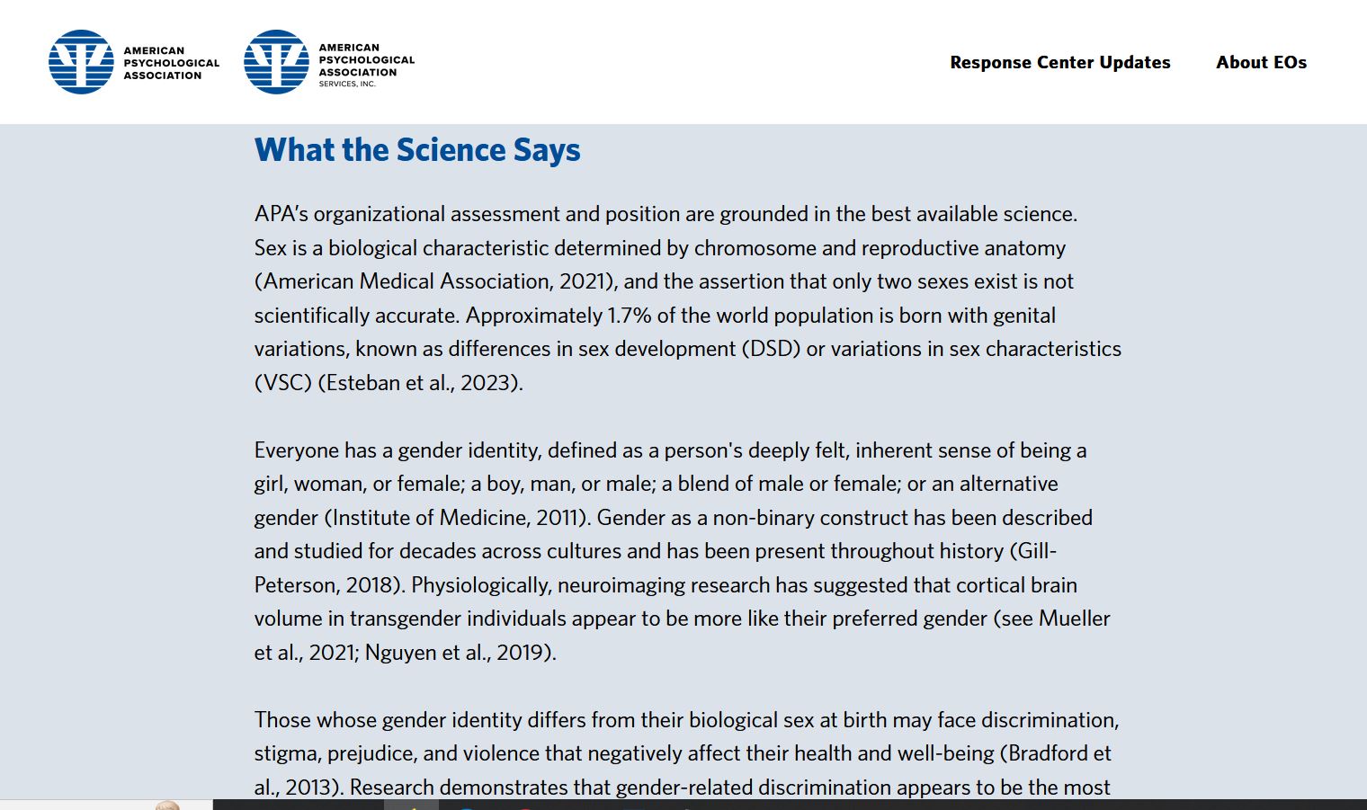 – **Lack of Specificity:** The statement is vague and does not define what constitutes “the best available science.” Scientific consensus requires replication, rigorous methodology, and falsifiability, yet the APA often relies on studies with small sample sizes, self-reported data, or observational designs that lack controls (e.g., many transgender health studies cited later). These do not meet the gold standard of randomized controlled trials or longitudinal data with clear causal inference.