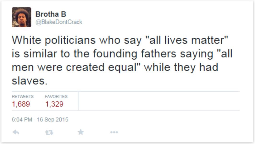 “It appears many “all lives matter” supporters feel that “Black Lives Matter” is not about equality, but rather focusing on the oppression experienced by only one group.”