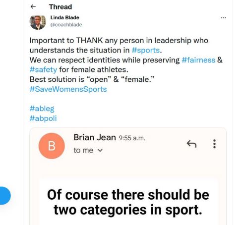 Wow! You see here, Janis doesn’t actually link to what she has labelled transphobic and hateful. Let’s move on to what she is referring to – a message to Linda Blade from Brian Jean a Leadership candidate for the UCP.