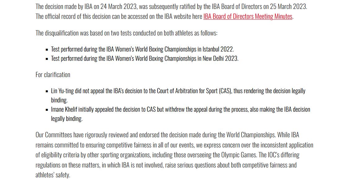 The last two days have been a revelation for me having gone down the Social Media rabbit hole on the males in female sport issue. What was most jaw dropping was the absolute conviction and dedication to a narrative that is most likely false. Both boxers Khelif and Lin Yu-ting did not meet the requirements for being female. Link here.
