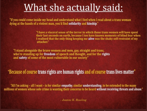 So, like many of the TRA statements, they are arguing against ideas and statements that have not been made by their opponents. The straw is heavy in most cases, as here is what Rowling actually has said –