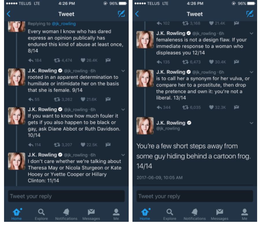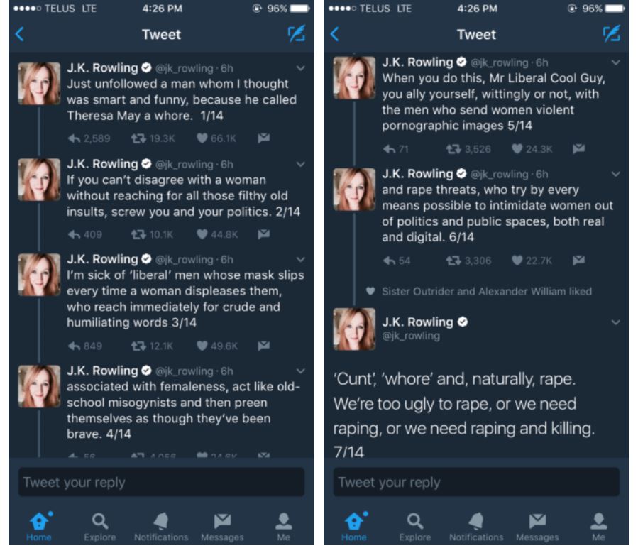 If there has ever been a motif to this blog, it would be the sentiment that J.K. Rowling captures in her Twitter feed. The experience of society for females and males is distinctly different, and that difference is deleterious for the female half of the world. Men like to dance around the fact that they have the world basically arranged and shaped for their benefit. The mask of ‘being a good liberal’ quickly slips though once it has been demonstrated that the female in question has the temerity not to back down and not know her place in society. Then we can see the real society that we live in. Threats to male dominance are quickly acted on and the abuse J.K describes happens.