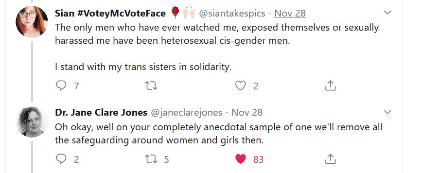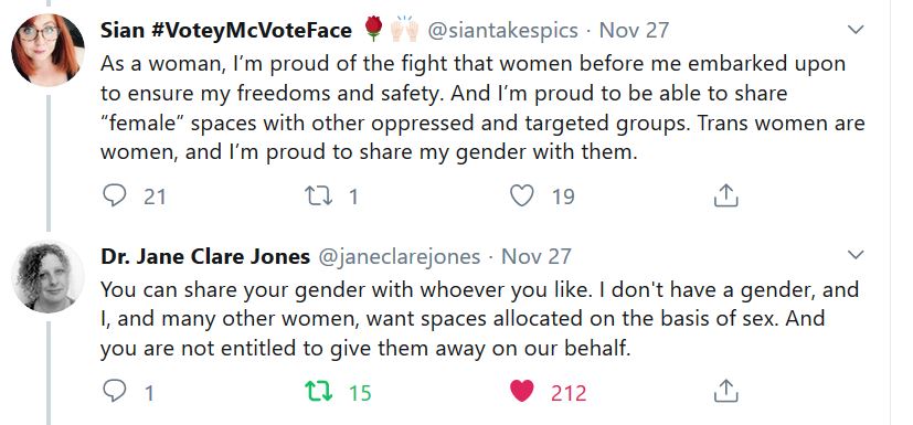 This leads to the second area where representation matters, the expression of women’s political interests. This is not simple, because under patriarchy women have the most fractured class consciousness of any oppressed group, and it is far from evident that women in positions of political authority are in the business of representing women’s interests. I would hope, however, that this is less true of the political consciousness of women inside a party set up by and for women. The question then is to what extent women and trans women share political interests. My claim here would be that trans women who respect the difference between trans women and women, and understand why women resist being redefined on the basis of gender, can stand in real and meaningful solidarity with women, although our interests still do not completely coincide. However, at present, given the effort to erase differences, redefine women by gender, and demand access to all sex-based spaces with no gatekeeping, the interests of women and those aligned with the present trans rights project, are, in fact, diametrically opposed. This was evident in Munroe Bergdoff’s much criticised injunction that women shouldn’t centre reproductive issues at the Woman’s March because it was ‘exclusionary’. It is also starkly illustrated by how often advocates of present trans rights discourse diminish the impact of male violence on women’s lives – as indeed Judith Butler did yesterday – and the extent to which being raised in a society that sexualises women from their early teens, demands that female people have sex-based spaces to preserve their dignity and humanity, as well as their safety. This is source of great regret, as opposition to male violence is one of the places where women and trans women’s interests should most closely align. On the basis of all these factors I would argue that – especially under current circumstances – it is not appropriate for trans women to represent women politically, and I hope in time we can move towards a place where we can stand in close solidarity with each other.