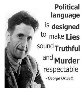 ‘one almost never finds in them a fresh, vivid, homemade turn of speech. When one watches some tired hack on the platform mechanically repeating the familiar phrases — bestial, atrocities, iron heel, bloodstained tyranny, free peoples of the world, stand shoulder to shoulder — one often has a curious feeling that one is not watching a live human being but some kind of dummy: a feeling which suddenly becomes stronger at moments when the light catches the speaker’s spectacles and turns them into blank discs which seem to have no eyes behind them’.