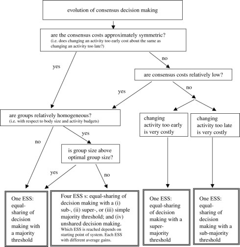 “With democratic decision making, however, the overall knowledge and wisdom of the entire group, along with the needs of the entire group, come into play. The outcome is likely to harm anybody, and the group’s probability of survival is enhanced. ‘Democratic decisions are more beneficial primarily because they tend to produce less extreme decisions,’ they note in the abstract to their paper.