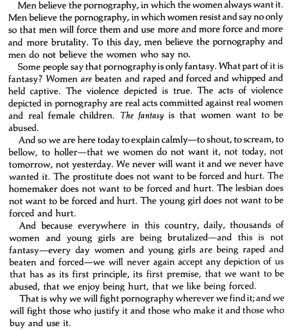 “People say, “Oh, well, pornography—that’s for masturbation, nobody can get hurt that way.” But orgasm is a very serious reward, isn’t it? Think of Pavlov’s little dogs, right? They don’t just think about salivating; they salivate. They do it because they learned it. Period. Now think about pornography. The dehumanization is a basic part of the content of all pornography without exception. Pornography in this country in the last ten years has become increasingly violent by every measure, including Playboy, including all the stuff you take for granted; and every single orgasm is a reward for believing that material, absorbing that material, responding to that value system: having a sexual response to stuff that makes women inferior, subhuman.”