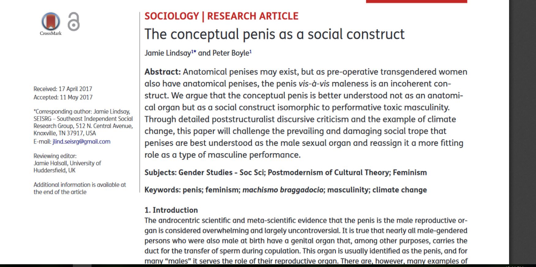 At the same time, the “Conceptual Penis” paper is a parody whose target is easily recognizable and unmistakable. The paper is ridiculous, certainly, but it is also immediately identifiable with the field it lampoons. The power of satirical parody lies entirely in its being recognizable for what it mocks. This lends credibility to our abiding suspicion that there is a problem in gender studies and, by extension, other fields of postmodernist studies, and with the moral architecture on the academic Left that enables them.”