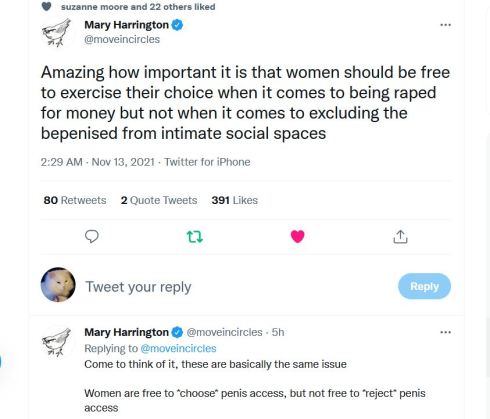 Calling prostitution damaging and exploitative one gets called anti-sex as if somehow rallying against paid-rape is prudish and old fashioned. In the second case rightly recognizing the threat and danger of males in female spaces one is called ‘transphobic’ or anti-trans for acknowledging safeguarding and ever present threat of male violence in society. Identify however you’d like but, your gender fantasy ends where the safety of others begins.