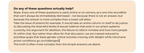 The era of ‘no debate’ is over. These questions are necessary to gain clarity and understanding of how gender self id legislation and gender ideology affects society and more specifically women.