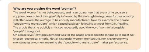 Linguistic erasure of females is one of the key features of trans ideology. If women cannot name their physical reality, how do they combat and improve their conditions in society? The trend is disconcerting as conditions that happen only to females are having the term woman and female replaced by vague nondescript words. For instance –