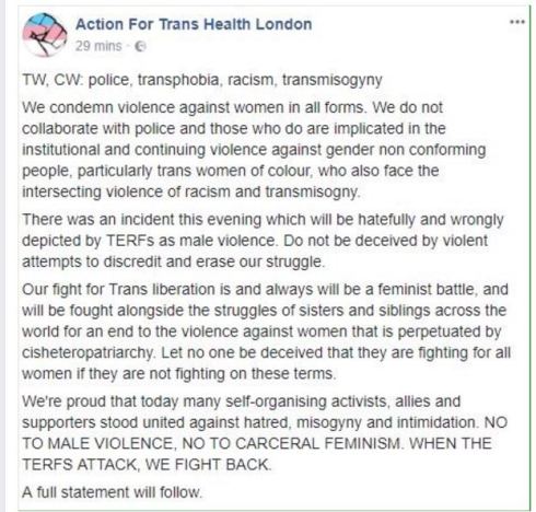 Just so we don’t have to play the “no true scotsman” game on the individual level, lets look at the response of Action for Trans Health London has to say regarding the incident where four male transactivists beat up a 60 year old woman.