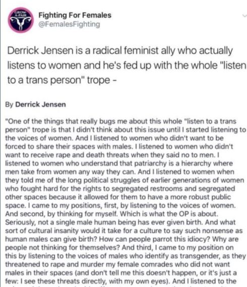 Derrick Jensen, so far has been one of the males that support radical feminism that has not turned out to be a complete horror show (yet). I hope that he can contain his male socialization and continue to be a supporter of women and their rights.
