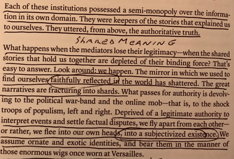 Society must progress, but not at the cost of the ideas and values that brought it together in the first place. The balance between progress and conserving has been off for awhile. The values that hold society together and the institutions that uphold them are in decline as people are distrusting what is coming out of our institutions.