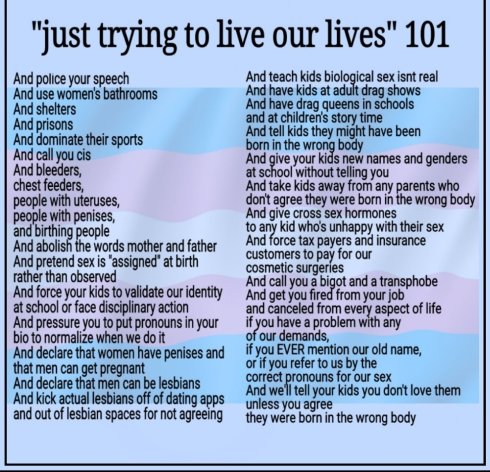 Mostly everyone in western democratic societies are free to reasonably live their lives – within the confines of what is currently acceptable in society. In this case, currently transpeople have *every* right afforded to other people that inhabit Canadian and American society. What transactivists and other parts of the activist Left don’t say is that they wish to radically alter society’s rules around *their* vision of the future (which,in my opinion, is mostly utopian dogshit).