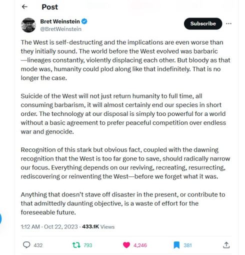 Two views on the current state of the West. Both share a fairly grim tone. We need to as nations of the West turn things around. The classical liberal* principles that our societies were founded on need to be restored and refreshed in their primacy of how we exist as people in society.