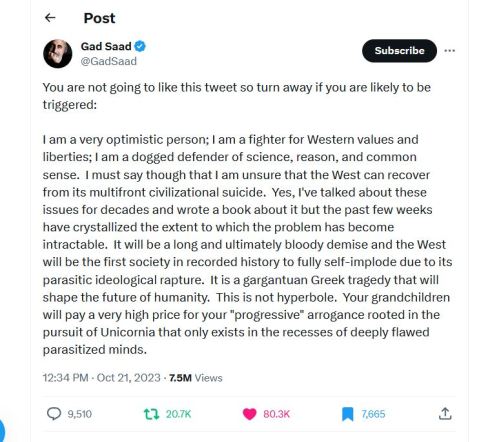 “How wrong I was. This past week, as over 1,300 Jews were slaughtered, the most murderous attack on Jews since the Holocaust, I saw the true face of Palestinians and their allies. All around the world, they celebrate. They gloat. They mock our tears. They do not protest against Hamas. They embrace pure evil.