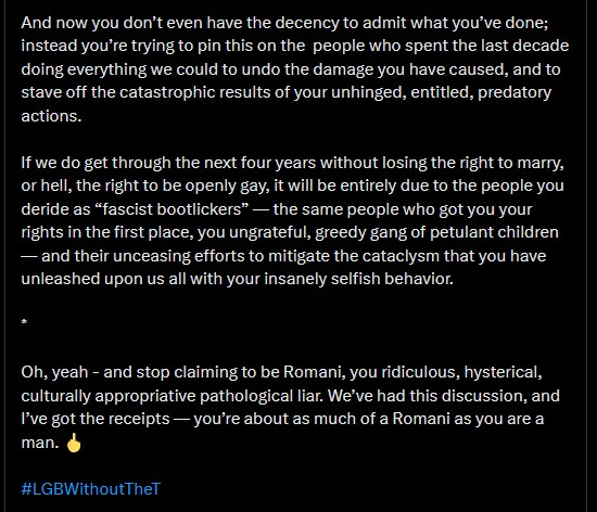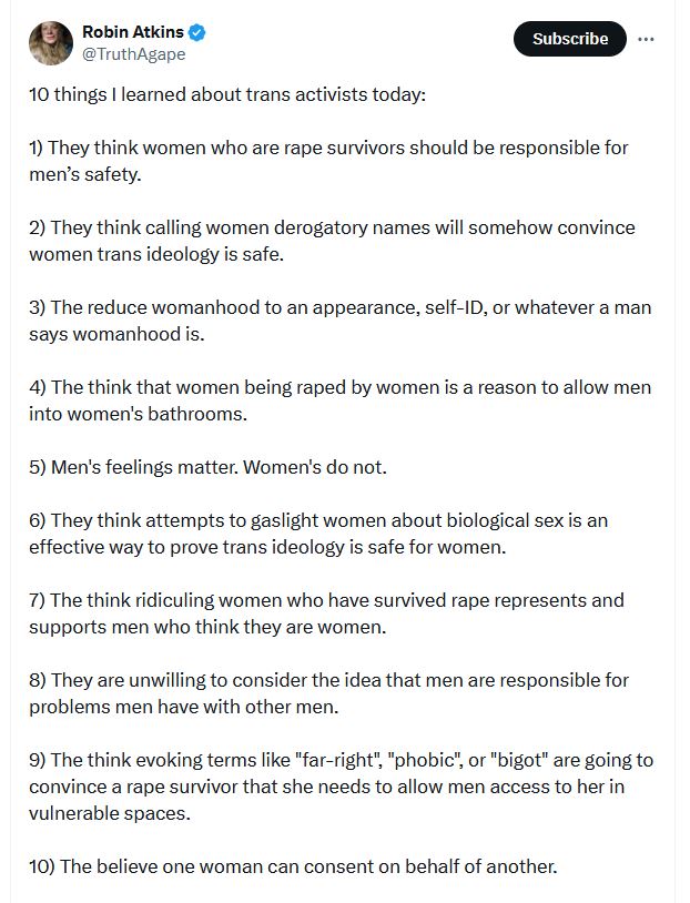 “I am more convincved than ever the trans movement is a deeply misogynistic destructive force created by those who want to destroy the fabric of society, harm women, and harm children.”