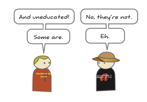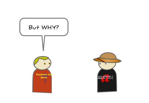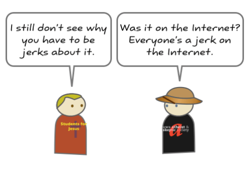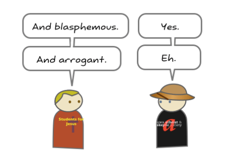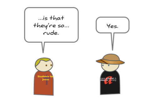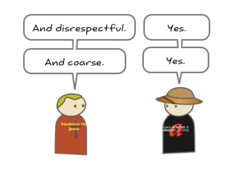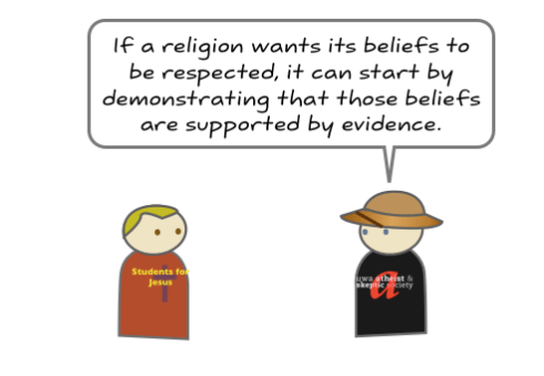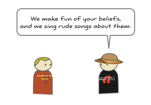 Why do atheists hate so much? Is it some sort of unnatural compulsion to blasphemy and make the religious feel uncomfortable? Well, not really. The message from this part of the atheist community is clear: believing in the supernatural is not rational and basing decisions that affect people and institutions on mythology is credulous behaviour at best. This cartoon has been making the rounds in various atheist hotspots( I found it on Good Reason) on the net, and I reproduce it here for you today for the Sunday Disservice. The cartoon is a concise summary of why many atheists sound and act the way they do.